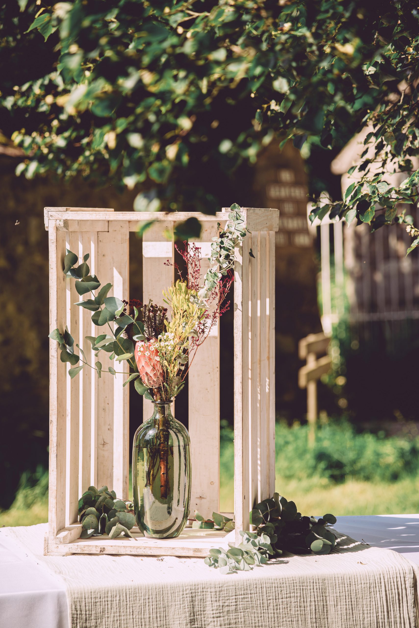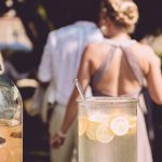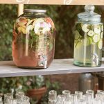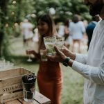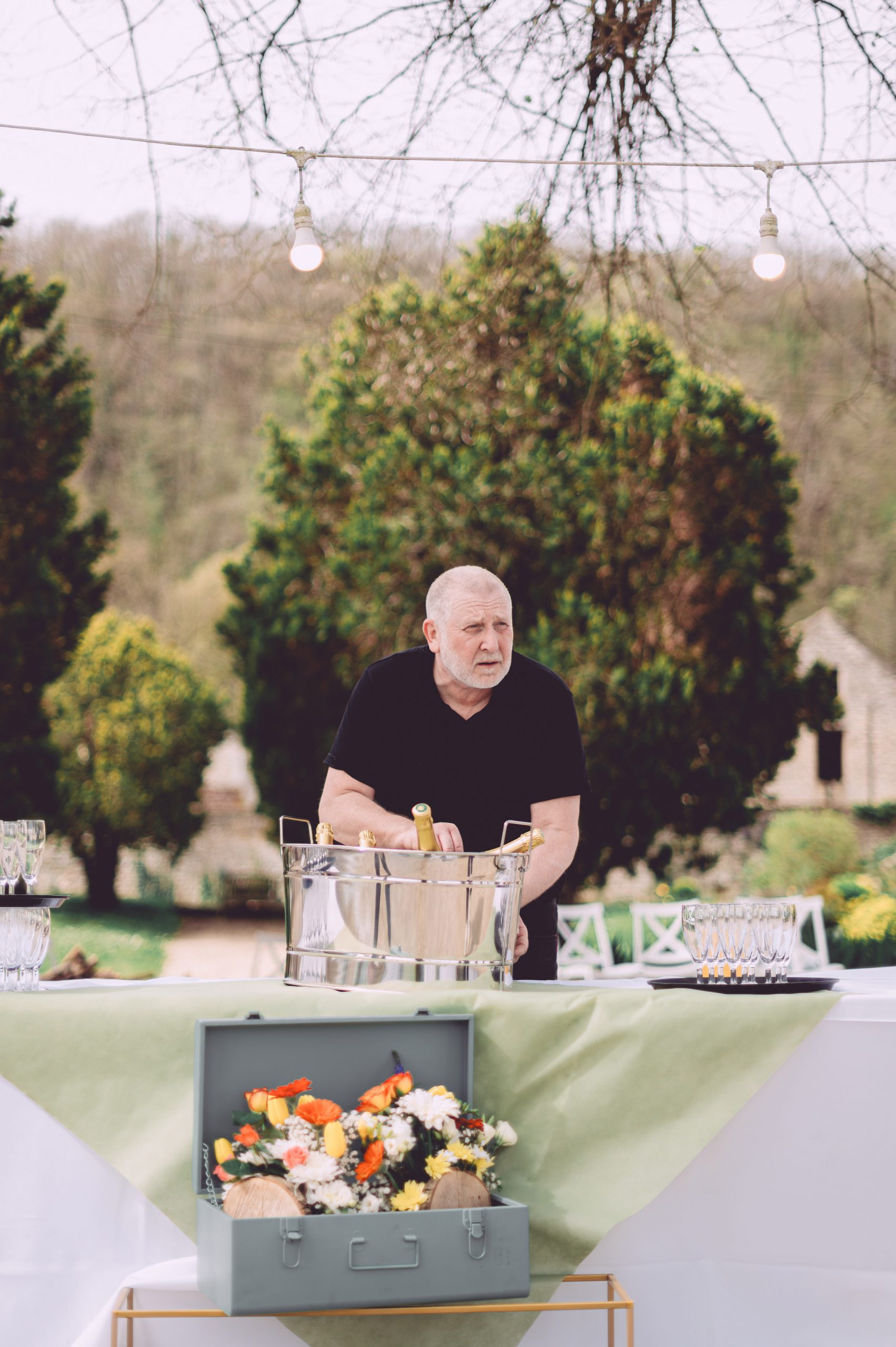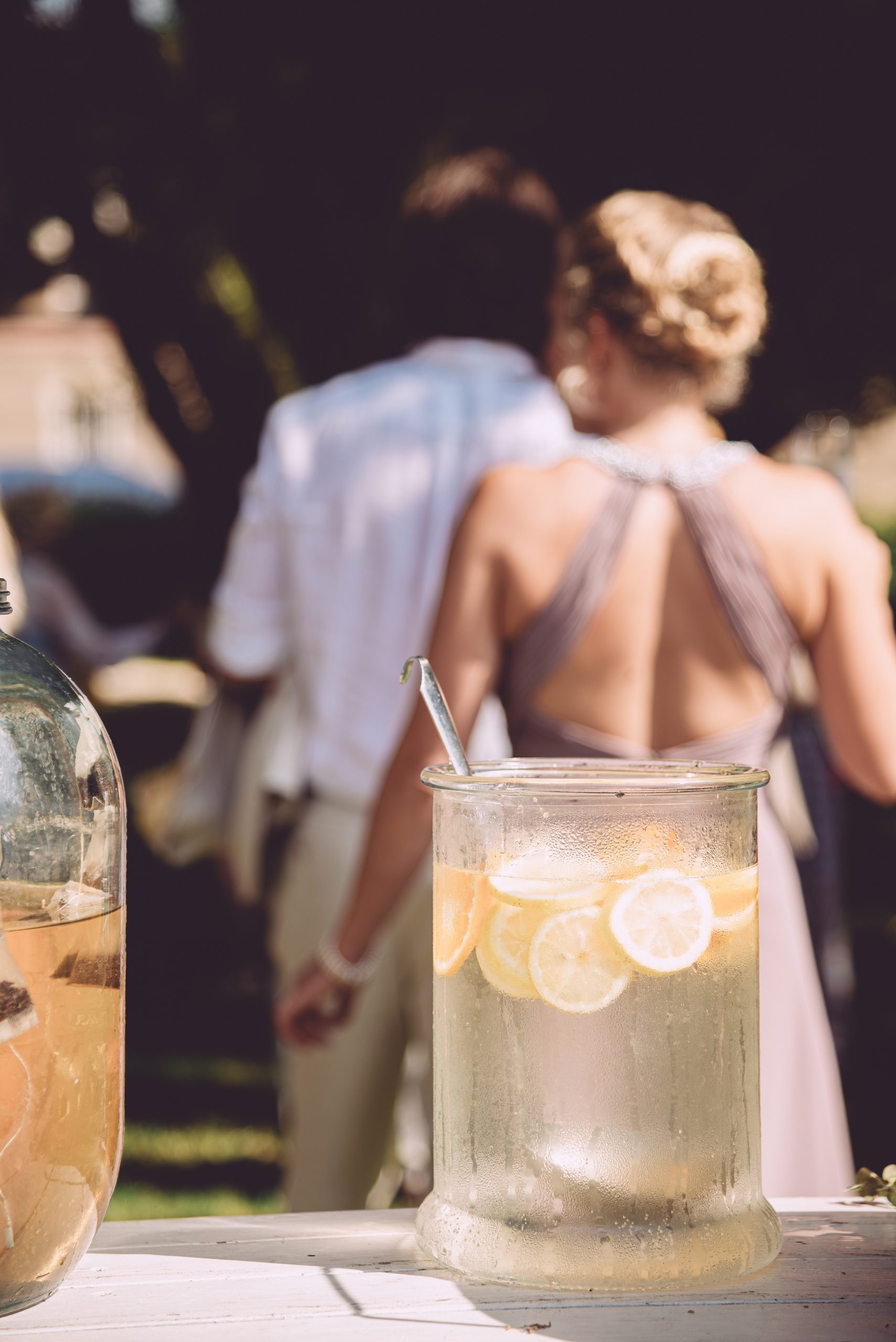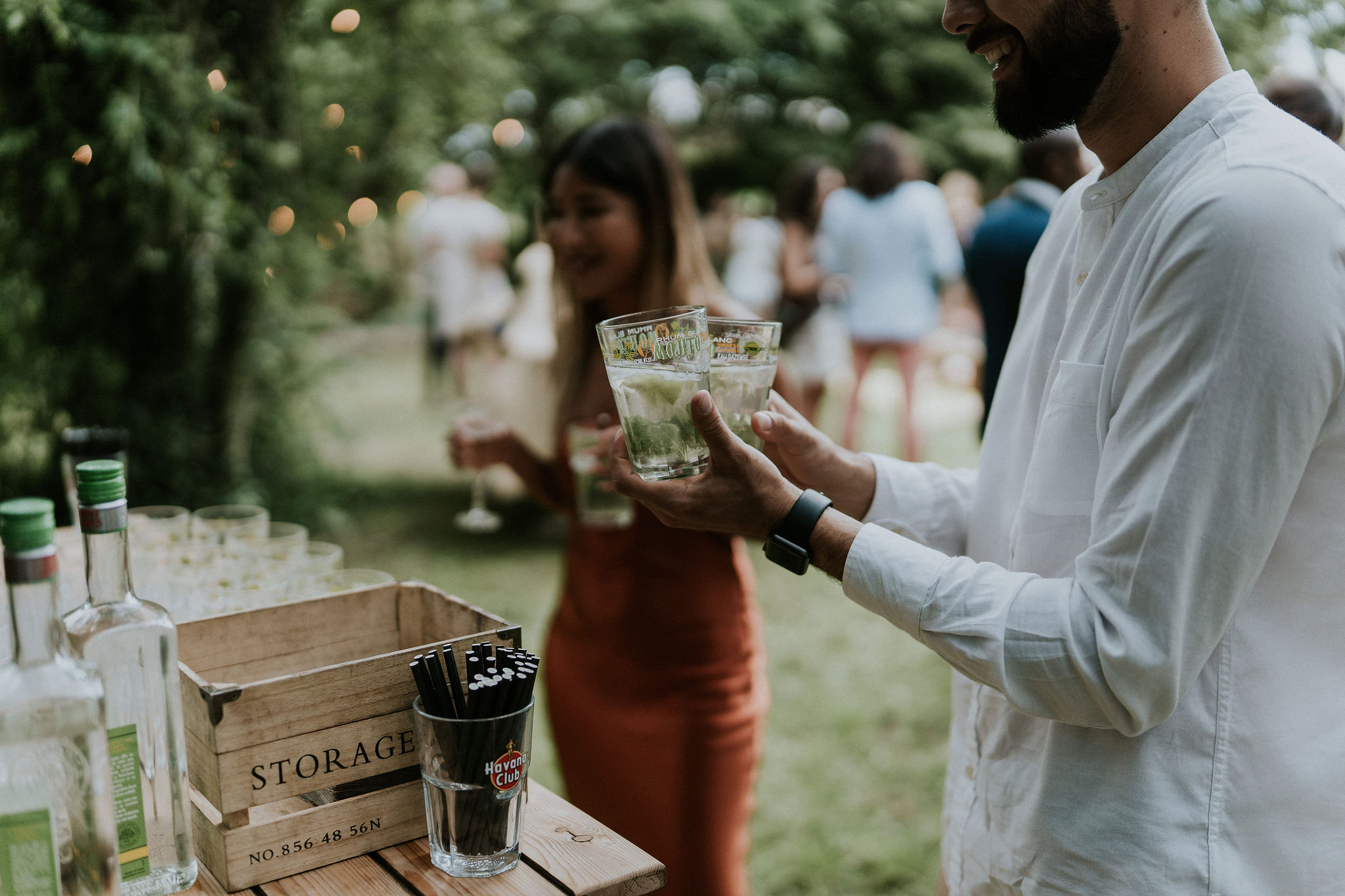 Joli buffet décoré, vaisselle et verrerie de votre cocktail. Eaux minérales, softs responsables en bonbonne vintage.