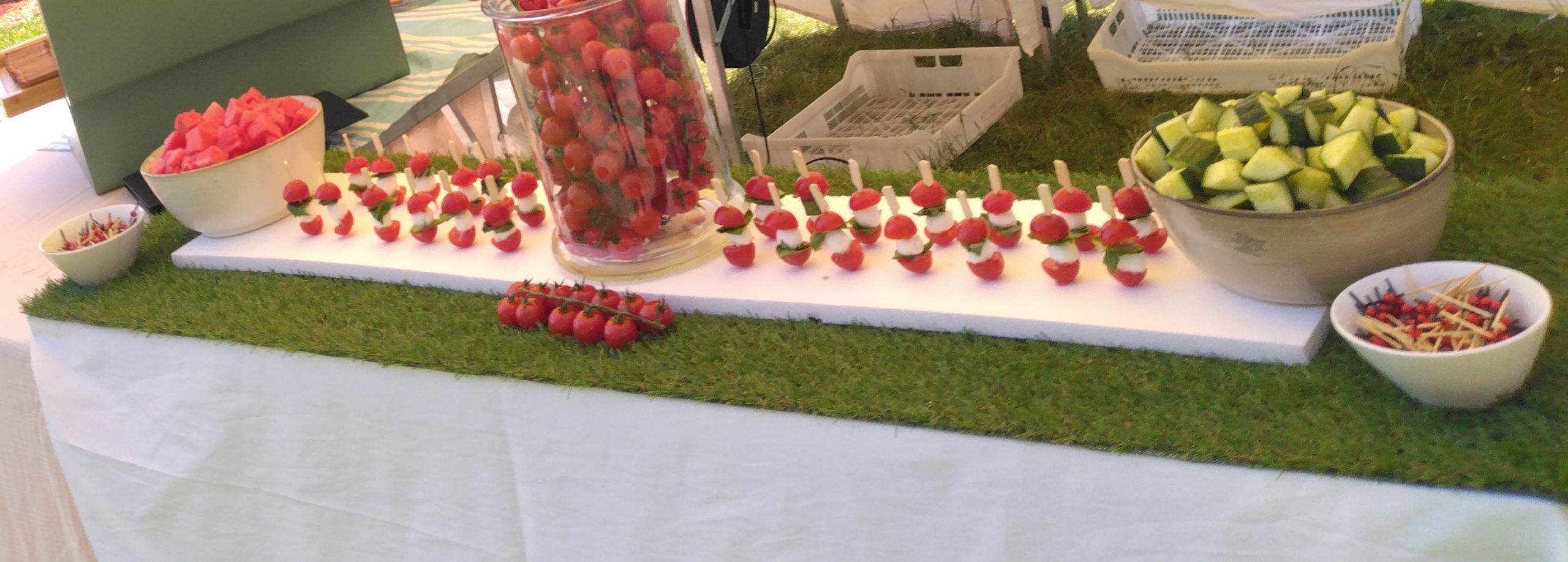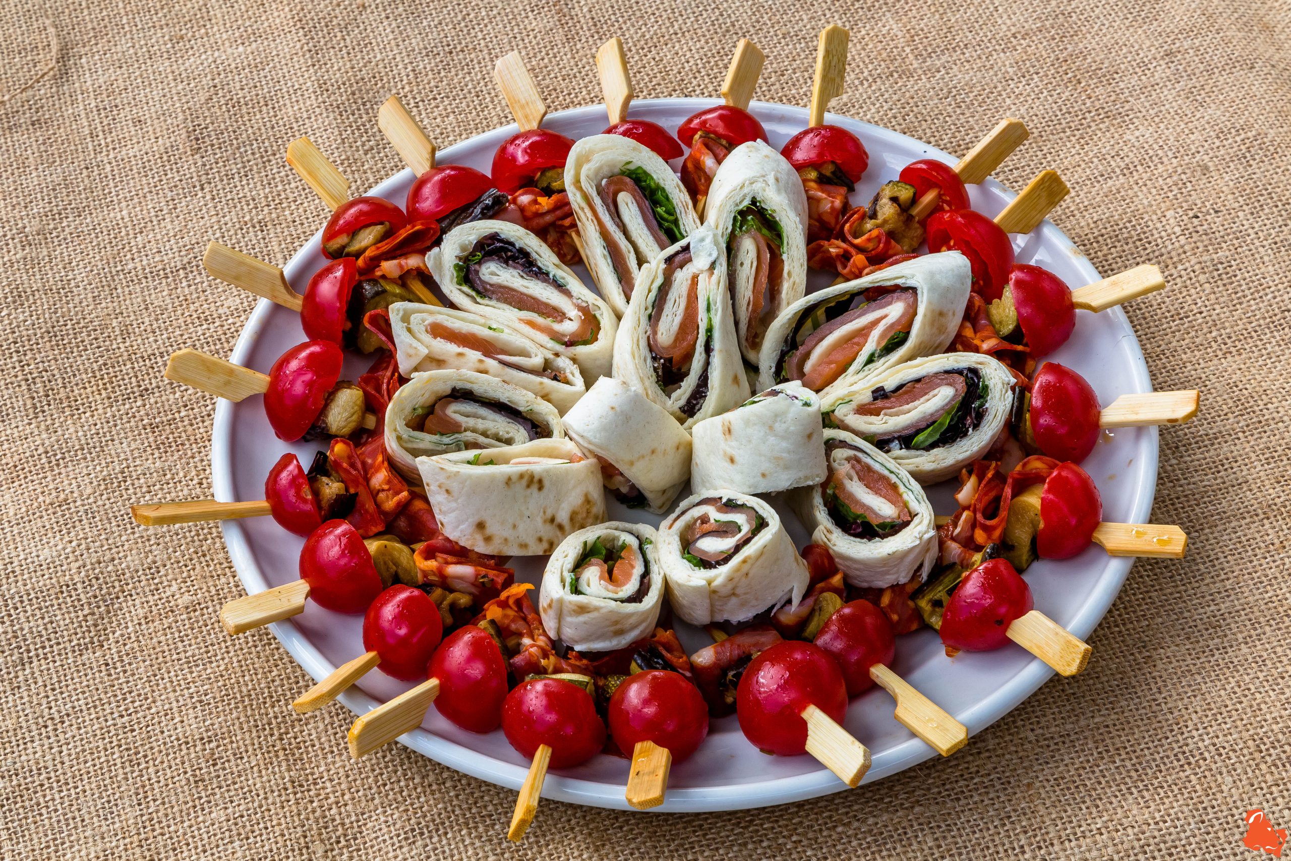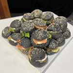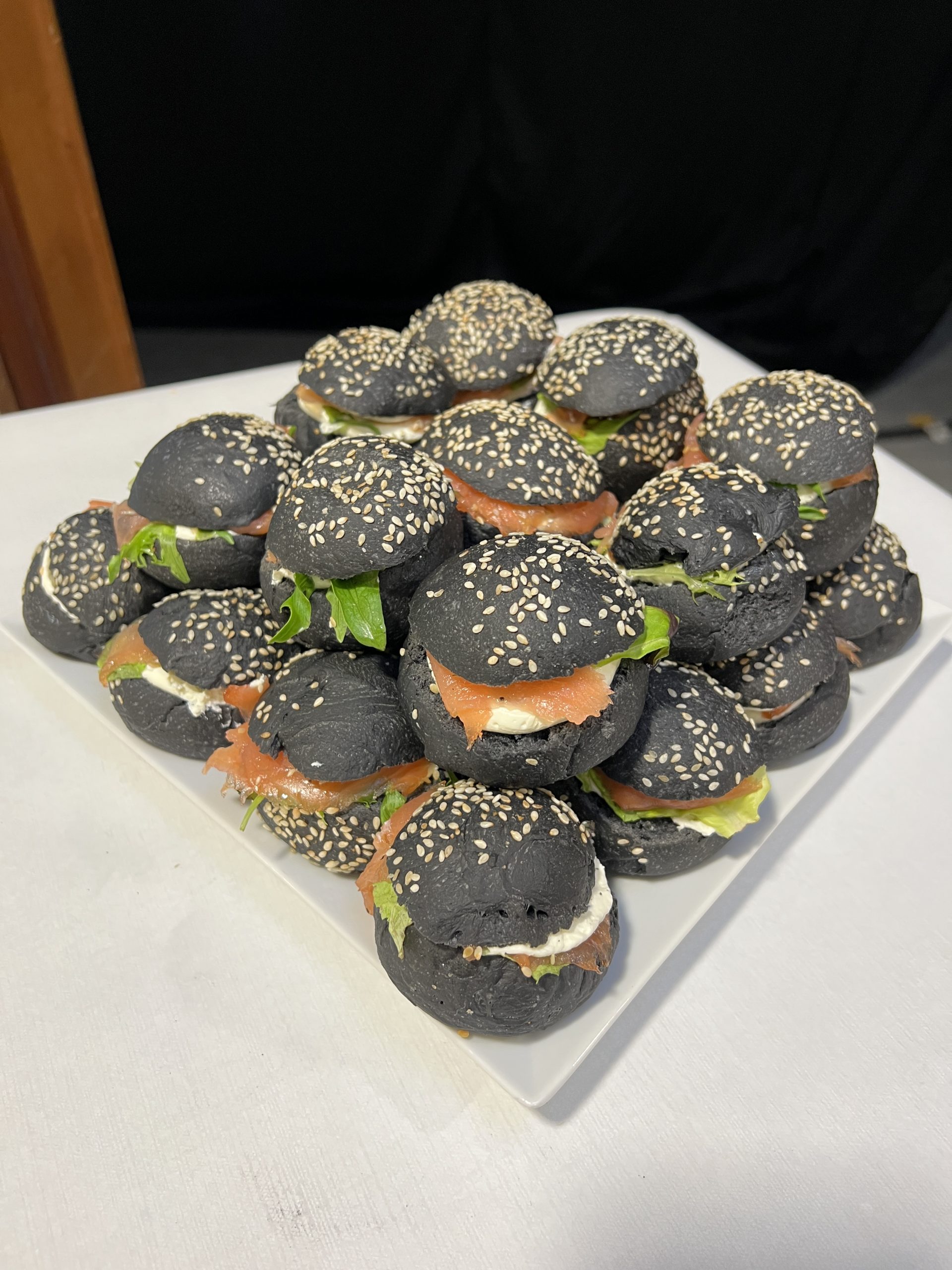 Exemple Brochette Tomate mozzarella – Kubik de saumon au sésame – Navette magret fumé – Samoussas légumes – Carpaccio St Jacques – Gougère forestière – Végétariens Buns – Black burger saumon wasabi