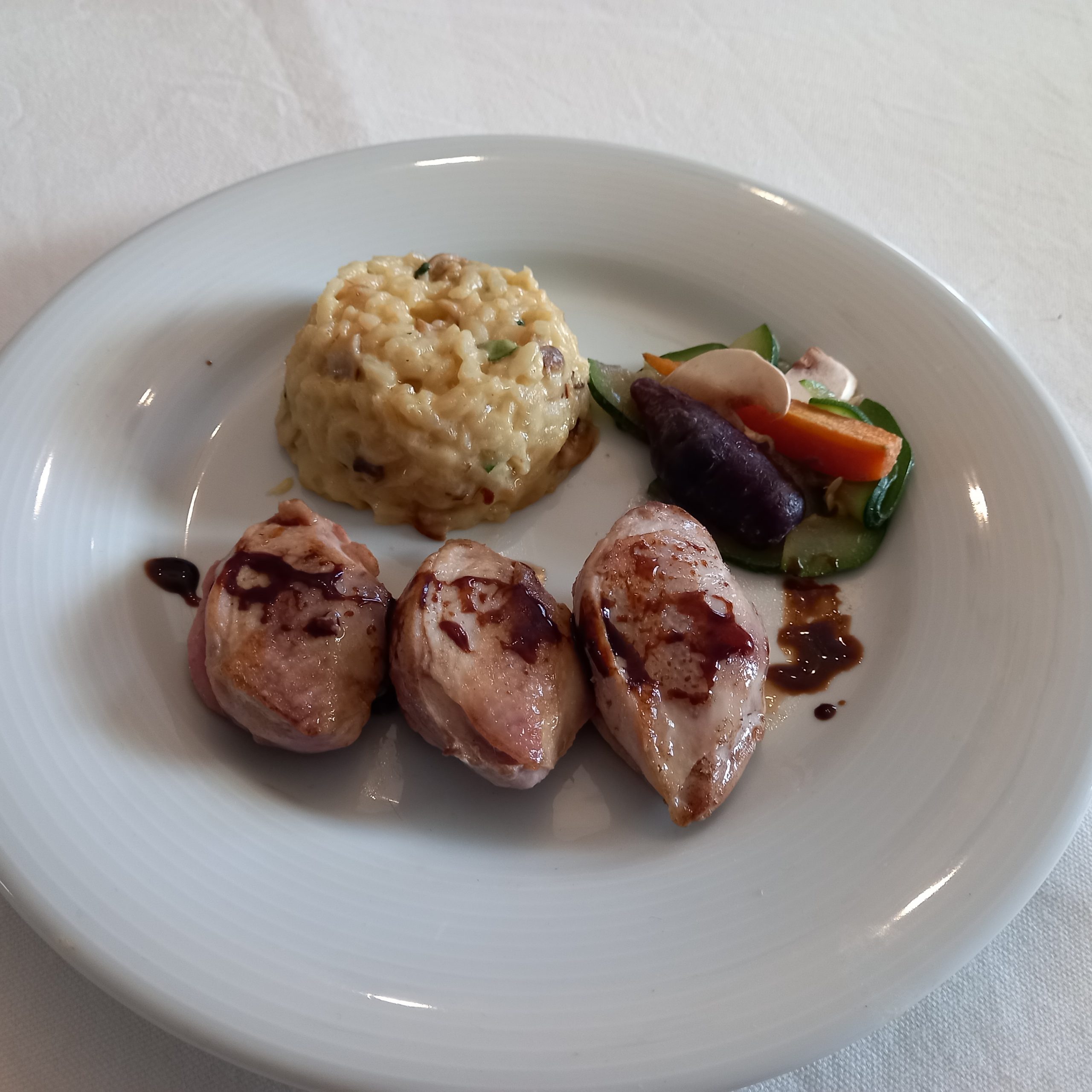 Risotto crémeux au chaource et ses filets de caille juste rôtie, sauce forestière